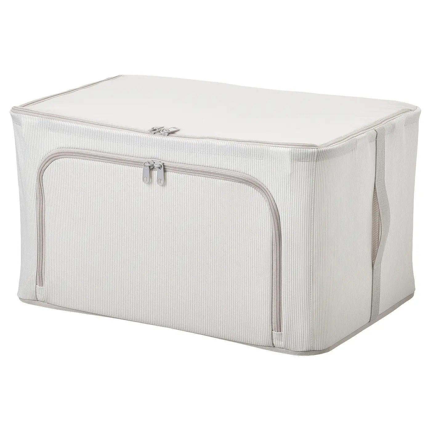 باکس زیپ دار ایکیا مدل HEMMAFIXARE یک جعبه نگهداری از جنس پارچه نرم که از محتویات در برابر گرد و غبار و کثیفی محافظت میکند. کاملاً در کمد لباس جا میشود و حتی میتوان آن را از کنار باز کرد تا به راحتی به وسایل خود بدون برداشتن جعبه از قفسه دسترسی داشته باشید.