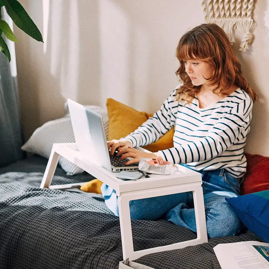 ميز رو تخت ایکیا مدل KLIPSK که با آن می توانید هم از صبحانه آخر هفته و هم ناهار کاری در رختخواب یا روی مبل لذت ببرید. و زمانی که می‌خواهید کارهای دیگری انجام دهید، پایه‌های تاشو استفاده از سینی را آسان می‌کند.